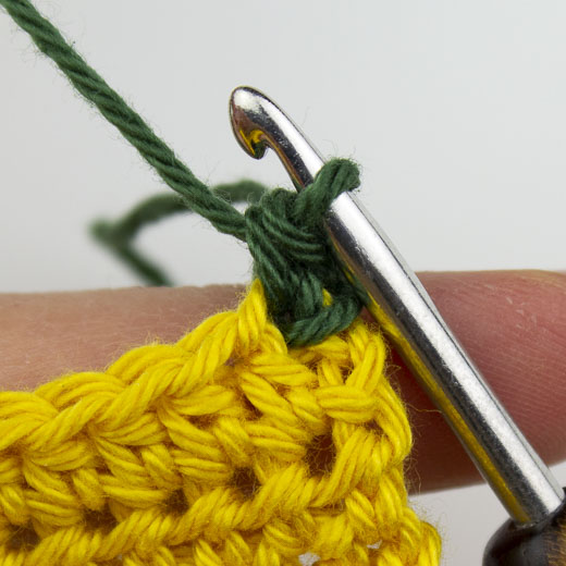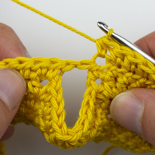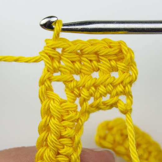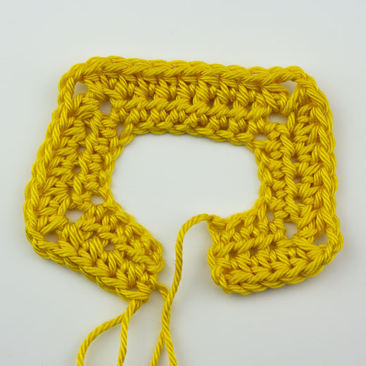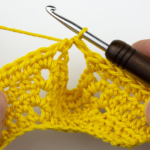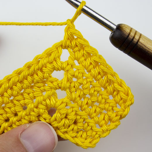 R. 6: Häkel 7 hStb und 1 hStb in die Ecke der Vorreihe.