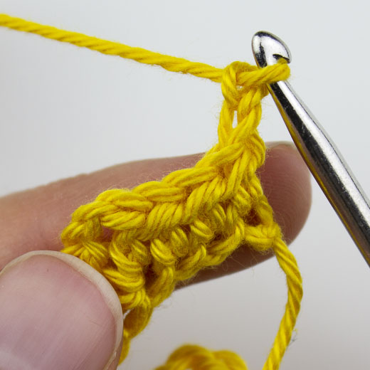 R. 3: Nach den 2 WLm wird das Häkelstück gewendet, sodass du entlang der Reihe zurück häkeln kannst.
