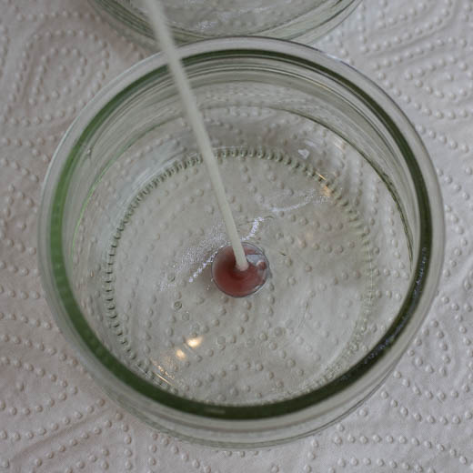 Wenn du ein dickes Glas verwendest, kannst du auch zwei oder drei Dochte für ein Glas nutzen, damit später nicht nur ein Loch in der Mitte herunterbrennt.