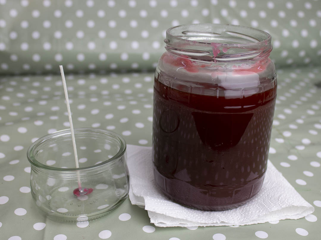 Wenn die Kerzenreste vollständig geschmolzen sind kannst du mit einem Schaschlikspieß die Dochtreste oder anderen Dreck herausfischen. In der Regel sinken diese Teile aber auf den Boden und du kannst erstmal etwas vom Wachs für neue Kerzen in Gläser füllen und zum Schluss die unerwünschten Teile herausholen.